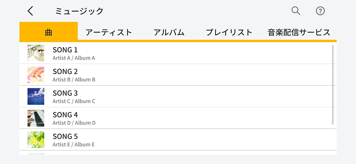 スマートフォン/タブレットに保存されている曲を一覧表示。曲名やアーティスト名などで検索できます。