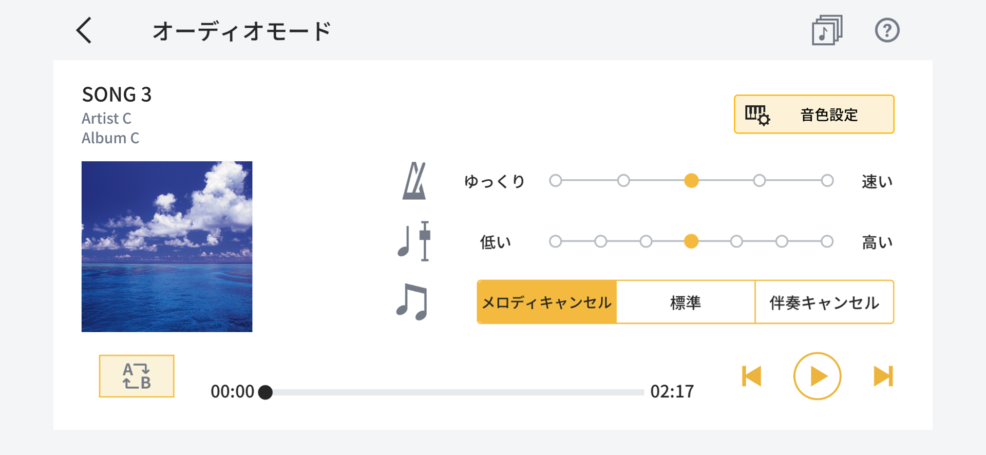 演奏スタイルに合わせて、テンポ調節、キーシフト、リピート再生、メロディ/伴奏キャンセルなどを設定できます。
