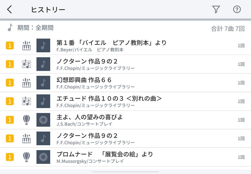 「ヒストリー」からは自分が、アプリ内の楽曲をどれだけ演奏してきたかを確認することができます。