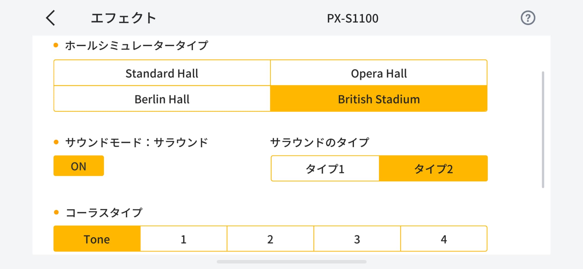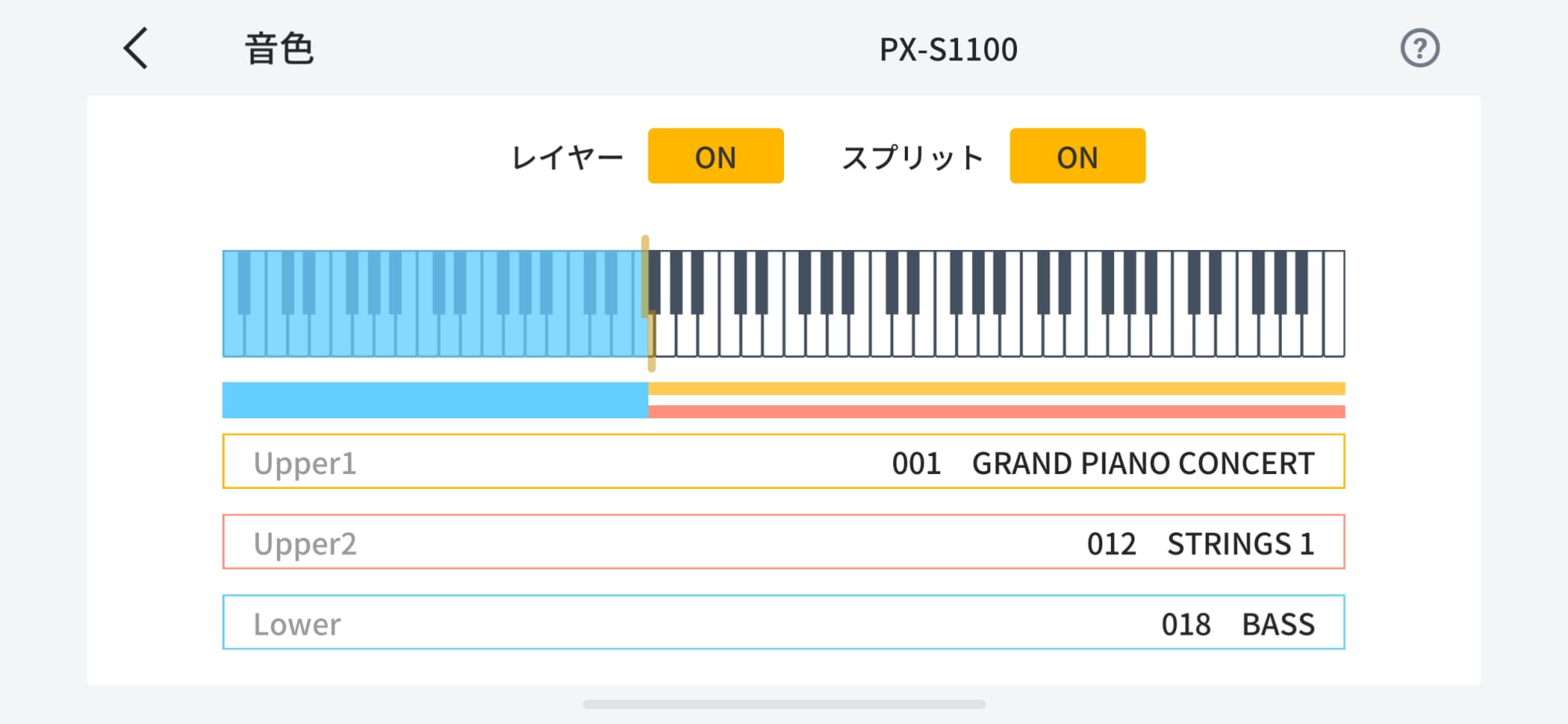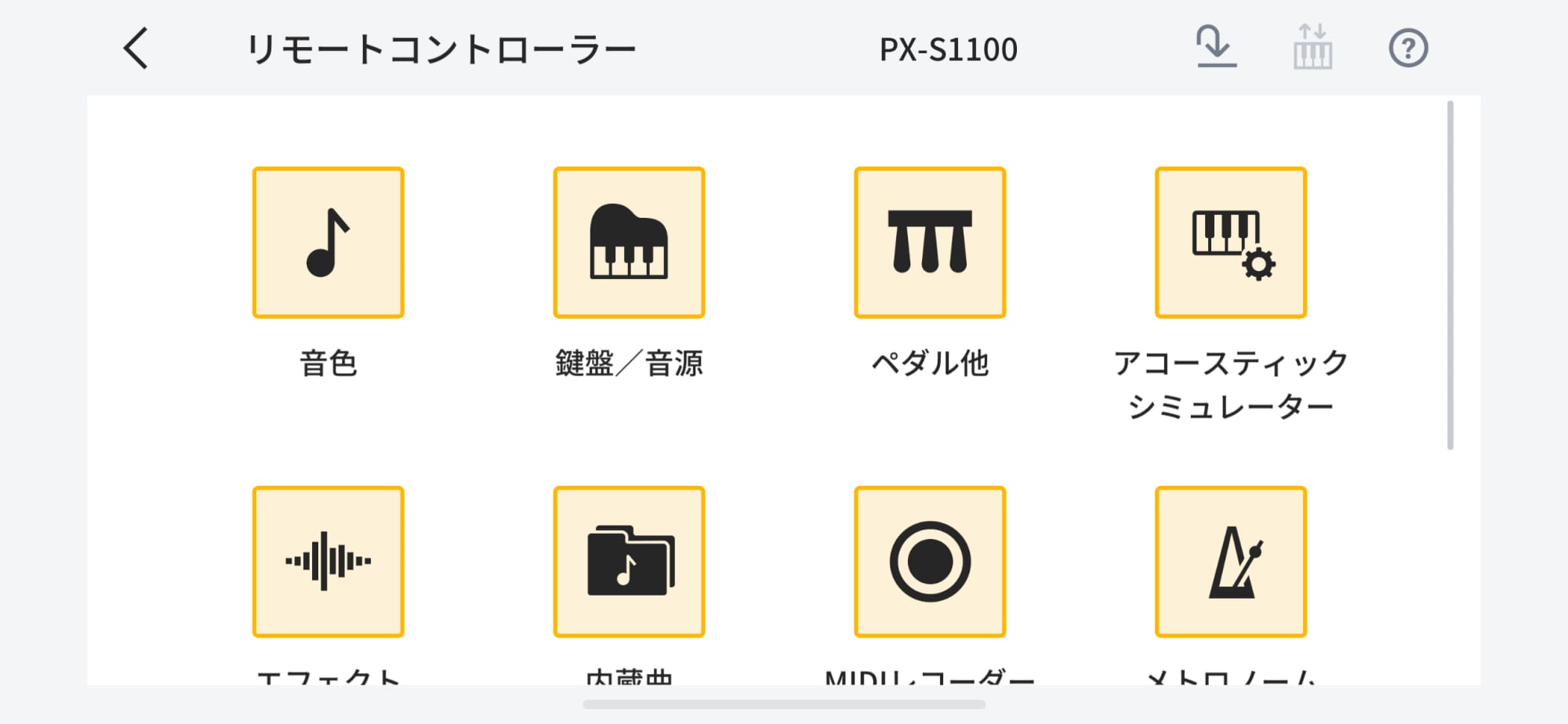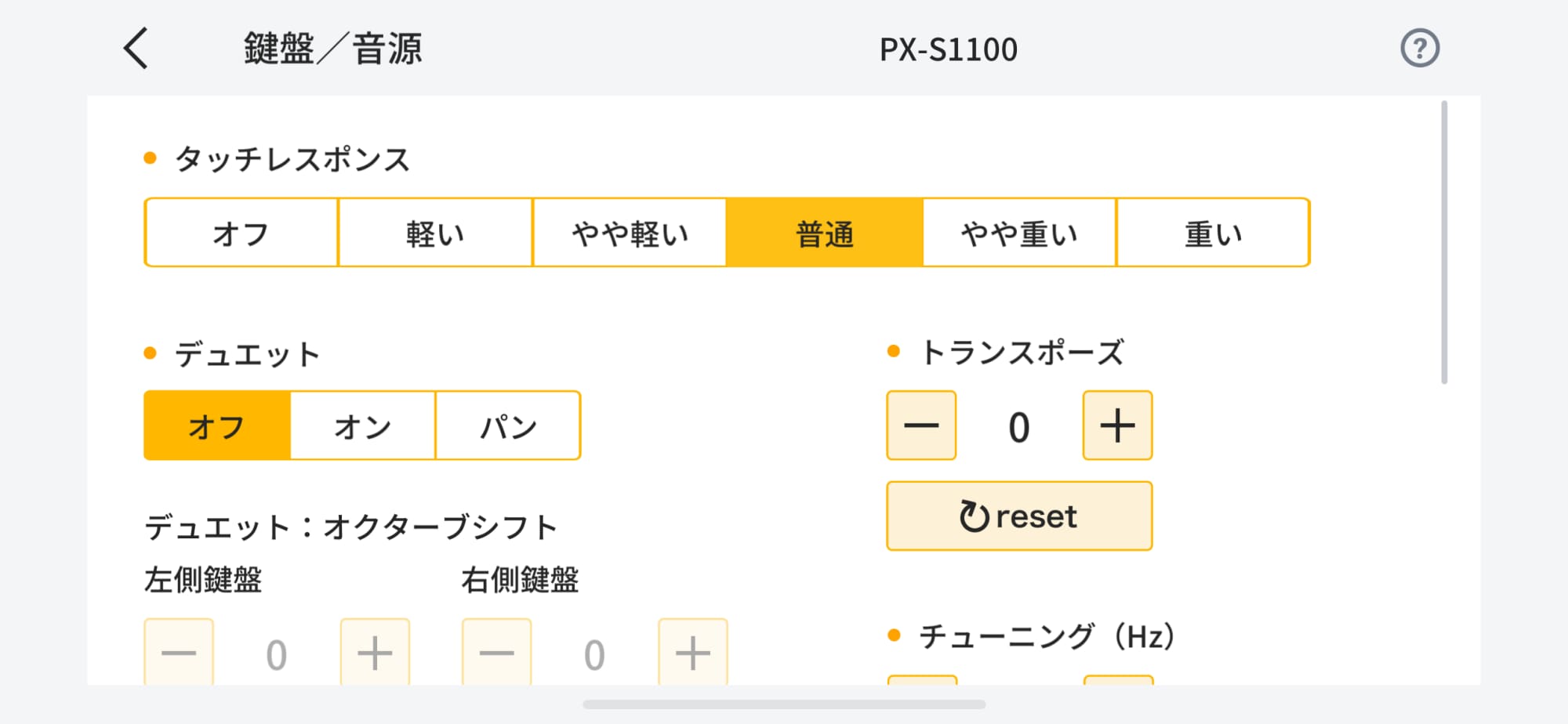 デジタルピアノ・キーボードの各種設定をアプリ上の一覧表示で確認しながら操作できる。
