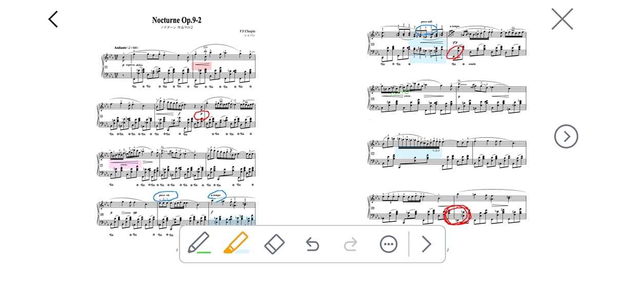 収録楽譜やインポートしたPDF楽譜への書き込みができ、書き込み内容の保存/呼び出しが可能です。