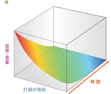 グランドピアノが弾き方や時間によって音色が変化するように、音の波形をなめらかに変化させる技術が「マルチ・ディメンショナル・モーフィング」です。打鍵の強弱や時間の経過による変化を三次元的にきめ細かにコントロールすることにより、優しく繊細な(ピアニッシッシモ)から、力強い(フォルテッシッシモ)まで、奏者の感性のままに表現できます。