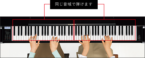 鍵盤の中央から右側と左側で同じ音域に設定することが可能。親子や、先生と生徒など、2人でお互いの音を聴きながら練習できます。
