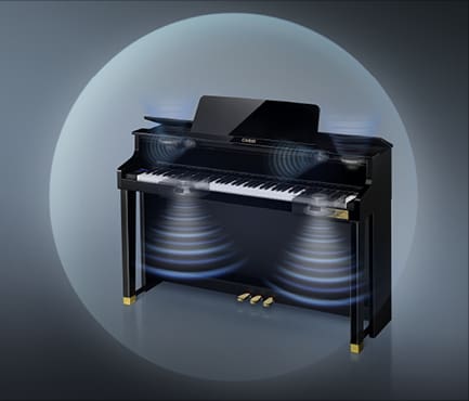 フルコンサートグランドを含むグランドピアノの音は、響板から上下に拡がります。その原理をもとに開発したのが、グランドアコースティックシステムです。6つのスピーカーの設置位置と音の通り道を工夫することで、上から聴こえる音は上から、下から聴こえる音は下から拡がっていく、グランドピアノと同様の音響を実現。低音域の響きを向上させることにより、低音から高音まで全ての音域において、フルコンサートグランドピアノのような豊かでダイナミックな響きを生み出します。また、音が本体内に隙間なく設置された鍵盤機構を通って拡散されることで、芳醇な音空間を創出します。