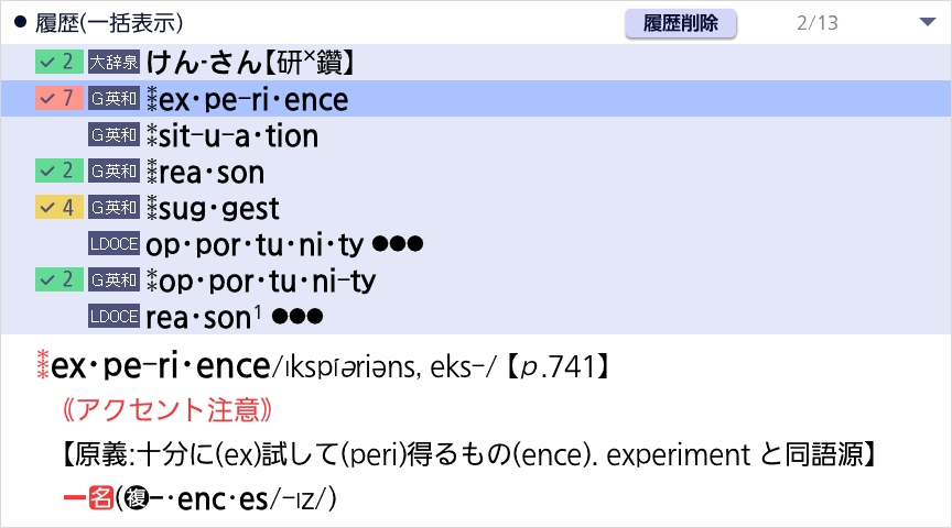 同じことばを複数回調べることで、履歴表示の一覧上に参照回数が表示されます。