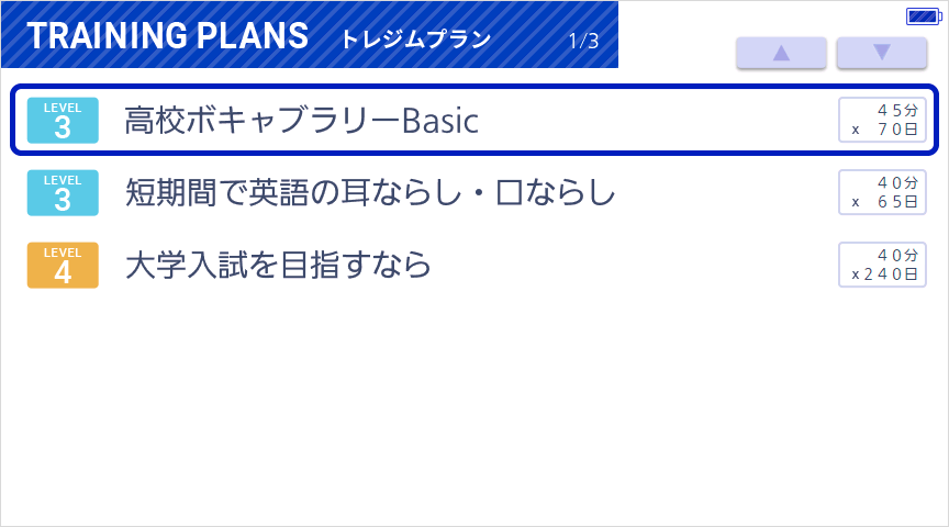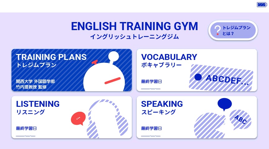 英会話学習の進捗が一目でわかる、「English Training Gym」を搭載。ボキャブラリー、リスニング、スピーキング、テスト対策の各分野を、達成度を確認しながら効率よく学習できます。また、レベルに応じた学習プランをガイドする「トレジムプラン」も収録。自分にあった学習方法が見つかります。