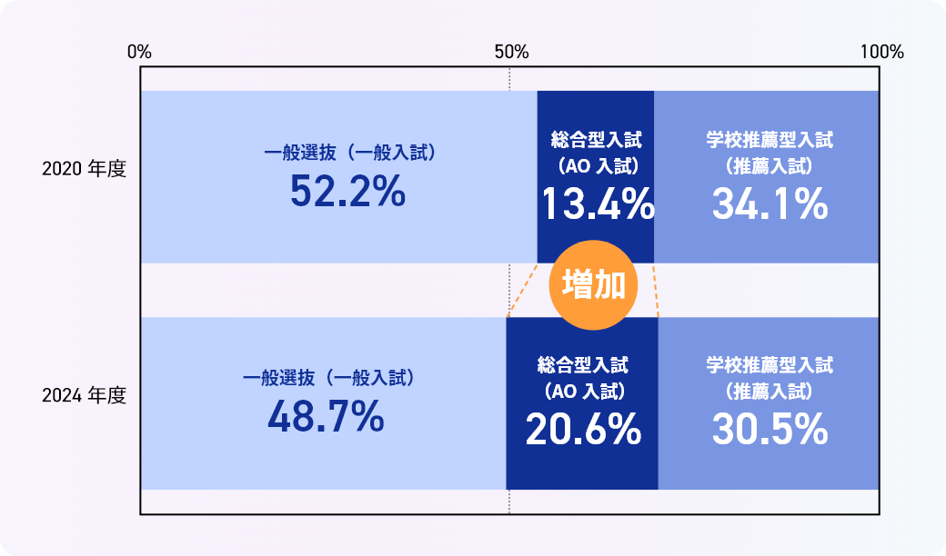 近年、総合型選抜入試は増加傾向にあります。この背景には、大学側が多様な学生を求めていることや、高校生が早い段階で自分の特性を活かした進学を目指す傾向が強まっていることがあります。