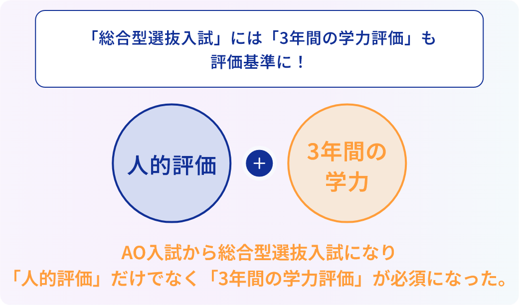 AO入試から総合型選抜入試へと変わり、「人的評価」に加え、「3年間の学力評価」も評価基準に加わりました。そのため、高校1年生から学習計画を立てること、継続的に学習を進めることが必要です。