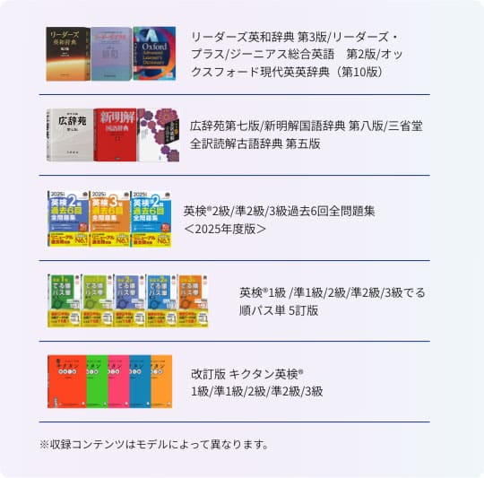 「リーダーズ英和辞典」など複数の英語系辞書や参考書でレベルに合った学習ができます。また、英語ネイティブ音声機能や英語例文検索機能により発音や英作文の学習にも対応します。