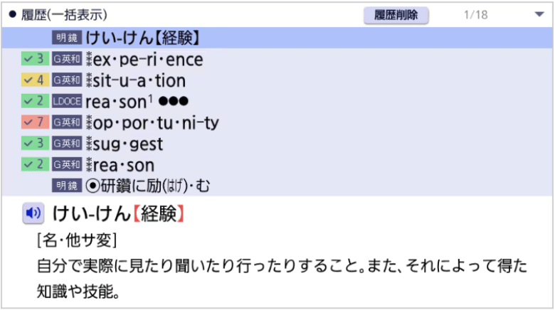 同じことばを複数回調べることで、履歴表示の一覧上に参照回数が表示されます。英和辞典の画面上でも参照回数を表示することで、復習などでの気づきを促します。