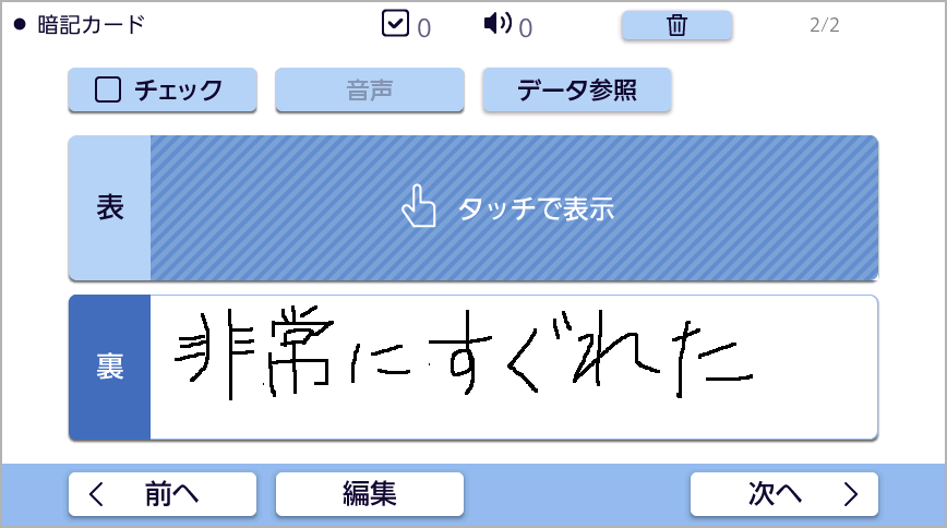 単語カードと同じ感覚で使うことができます。覚えたい事柄を「表」と「裏」の一組で保存し、繰り返し見返すことができるので、単語の暗記に便利です。