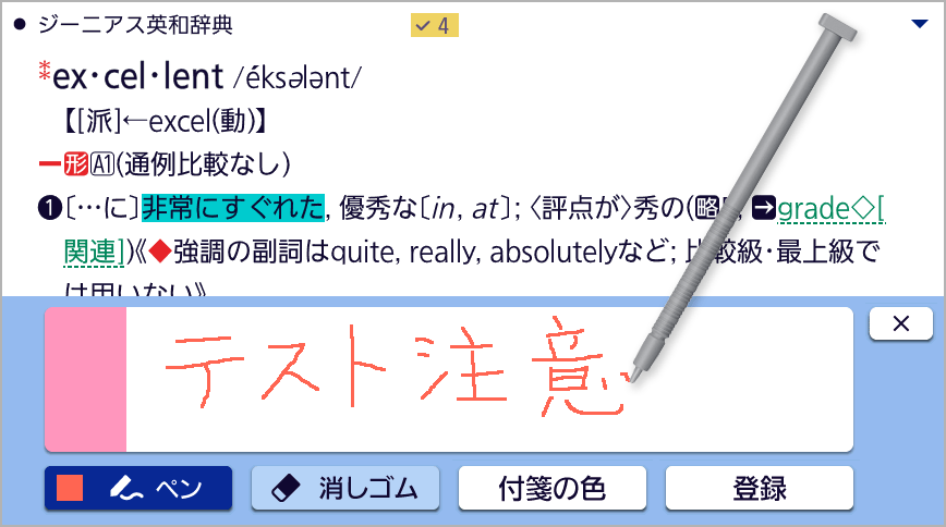 辞書に付箋紙を貼る感覚で、コンテンツの見出し語に手書きのコメントを登録できます。文字色は黒 / ピンク / 黄色 / 水色など、全20色から選べます。付箋の色も5色から選べ、色ごとに分類することが可能です。