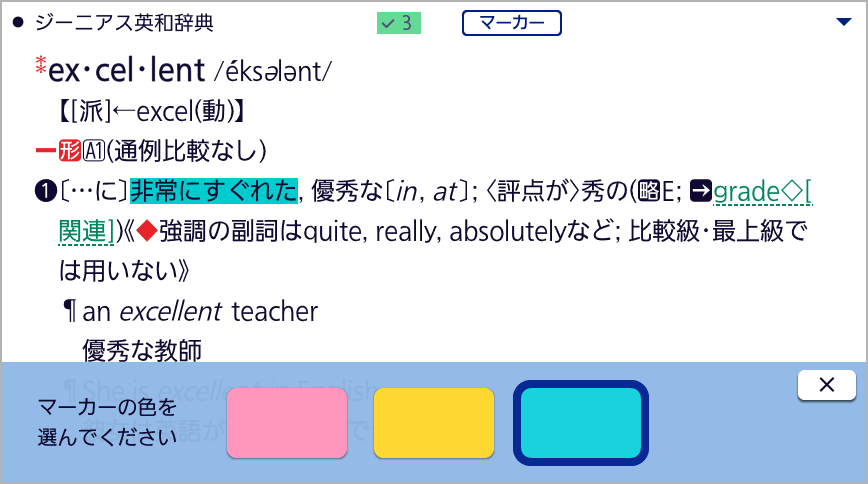 表示される文字にマーカーを引くことができます。ピンク / 黄色 / 水色の3色から選べ、指定した色のマーカーを引いた文字だけを隠すこともできるので、暗記学習に便利です。