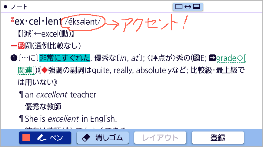 コンテンツの字引き後の画面をはじめ、イラストや写真の画面、白紙のノートにタッチペンを使って手書き文字などを書き込むことができます。