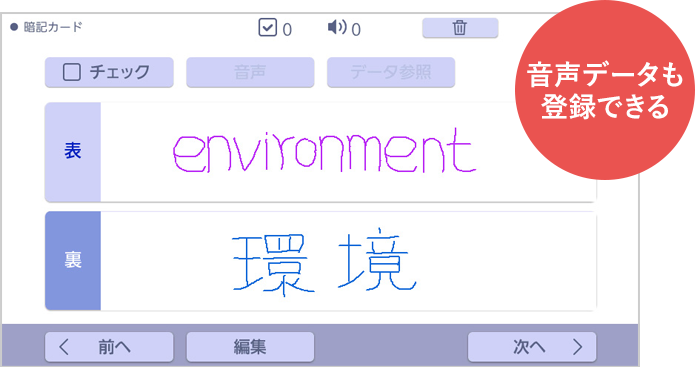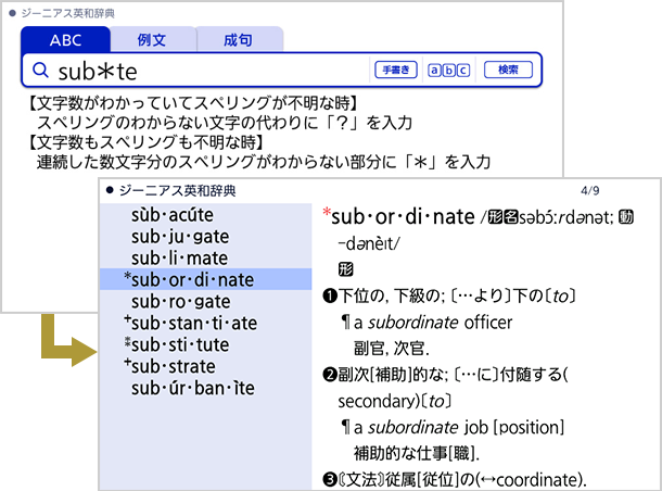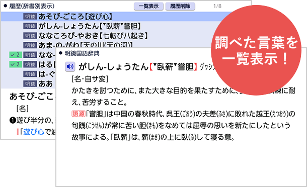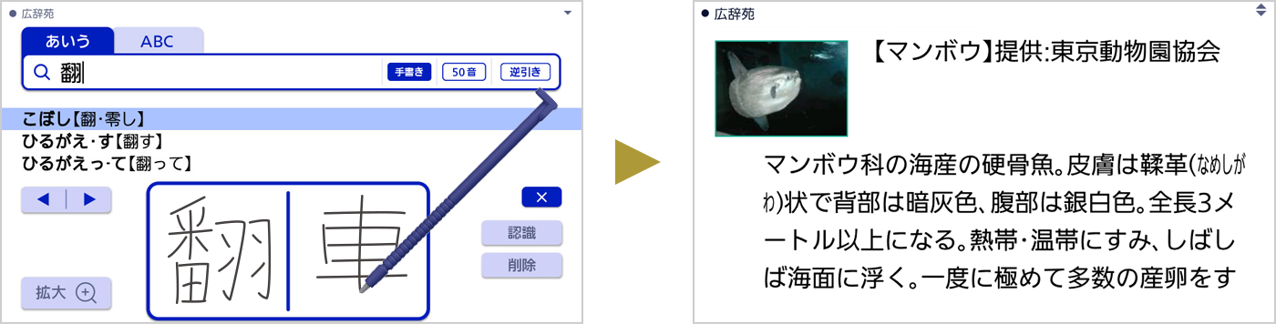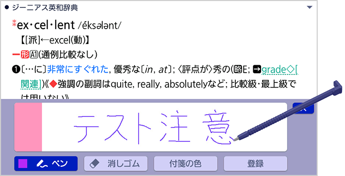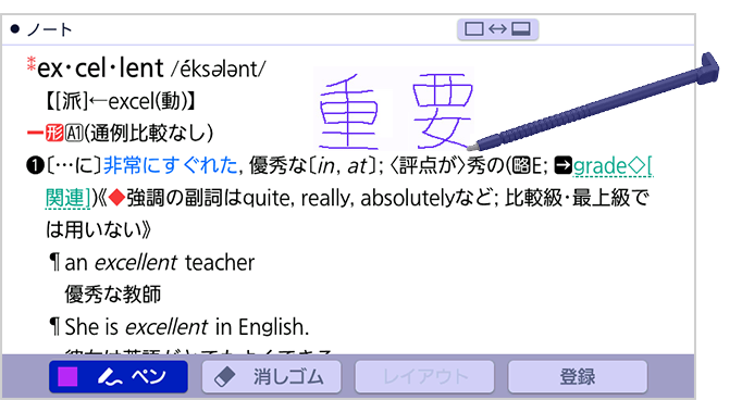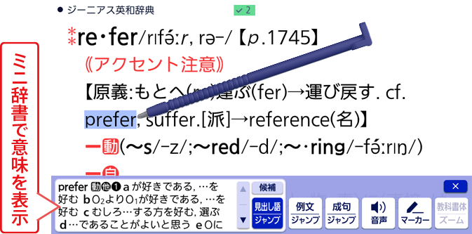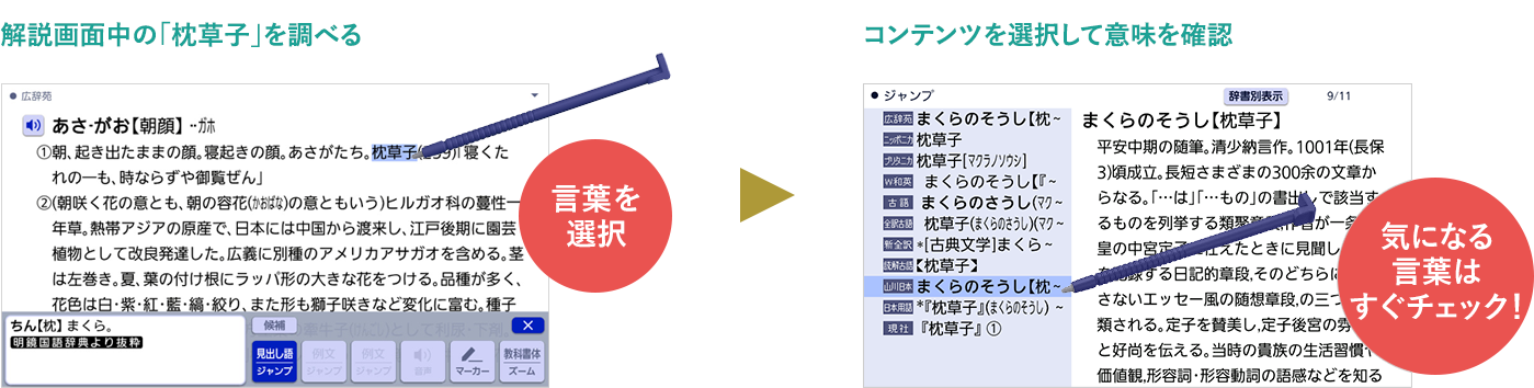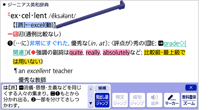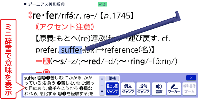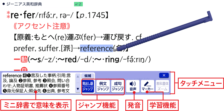 言葉をなぞるだけでタッチメニューを表示。意味や発音の確認、ジャンプサーチなど多彩な操作が可能。