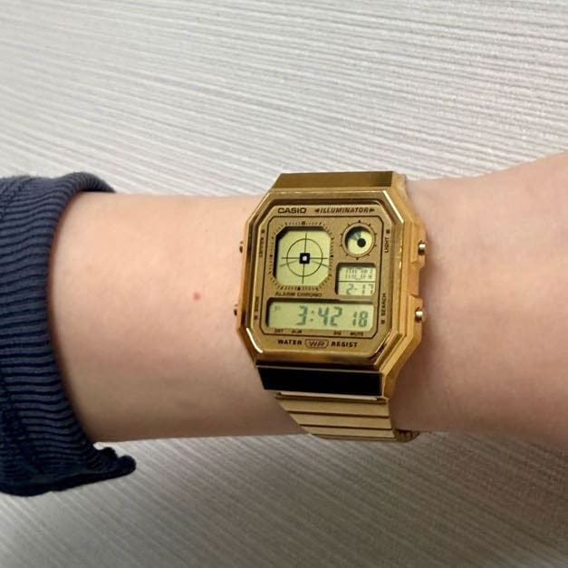 レトロフューチャーなデザインにゴールドのカラーリングは、スタイリングを決める1本になってくれること間違いなし。液晶でアナログ表示もするこのシリーズは、いつもとは少し違う印象を演出してくれます。ラフにもスポーティーにも合わせやすいウオッチです。