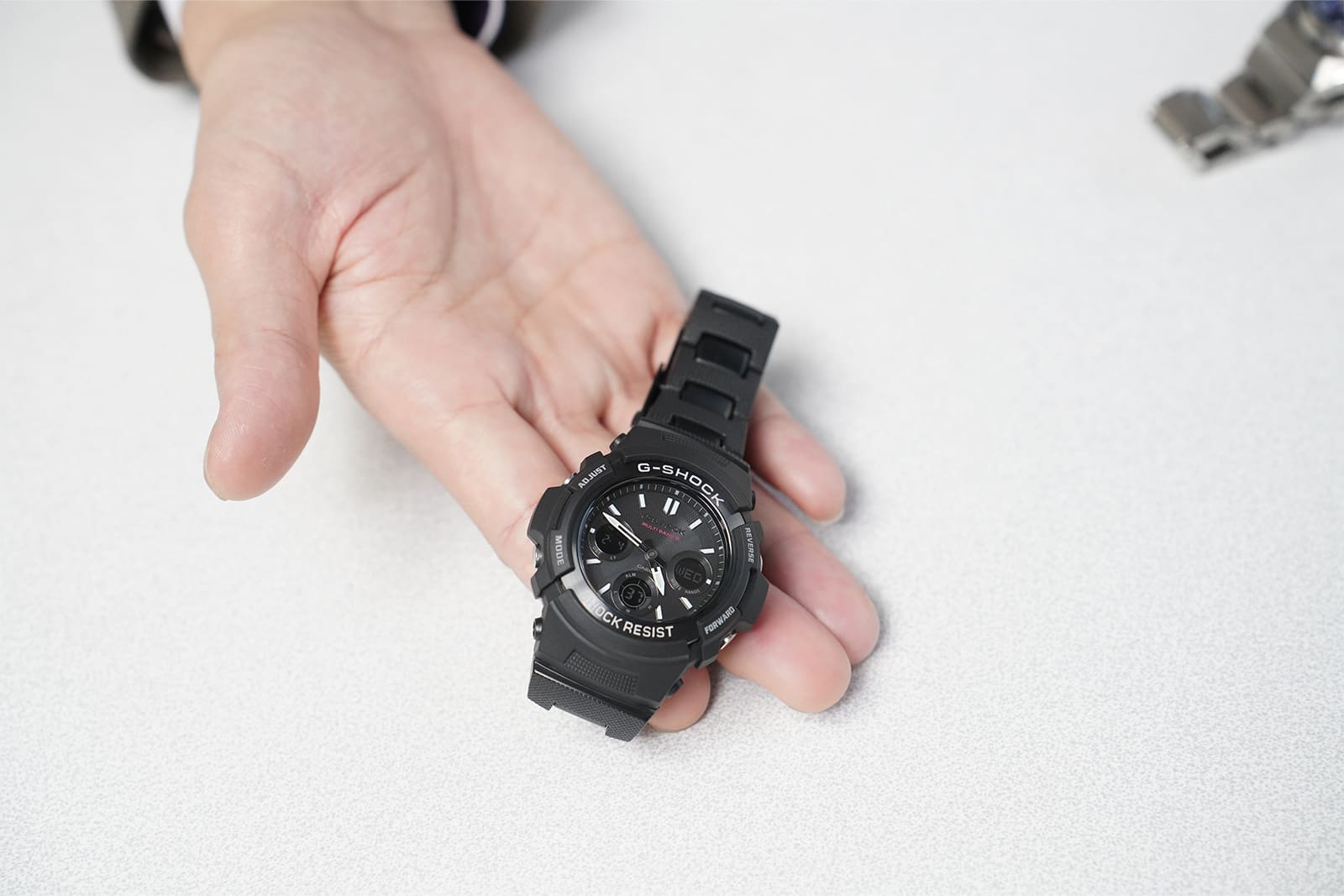 Aさん:実はG-SHOCKは秒数表示がデジタル液晶になっているデジタルアナログモデルが多いので、秒針までついたアナログは少数派なんですよ。でも時計好きだと秒針が結構重要という人も多い。まさにアナログ時計として魅力的なデザインだけど、G-SHOCKならではの耐衝撃構造で、20気圧防水もあるというね。
