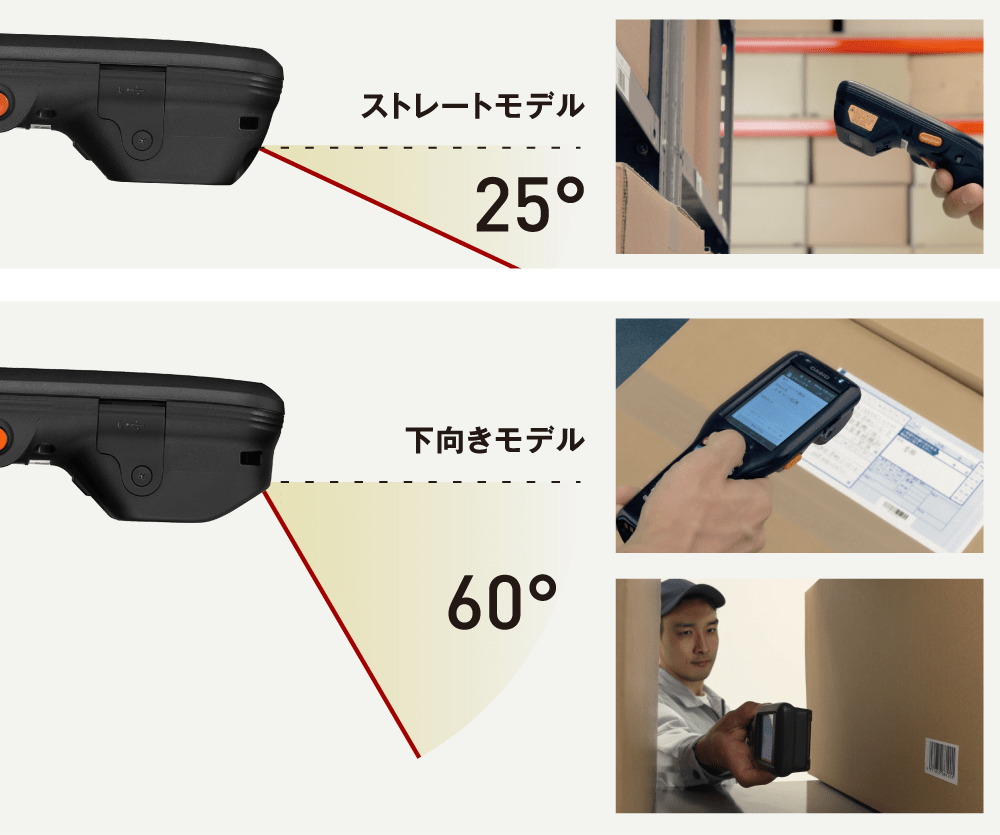 スキャン角度が25°と60°の2モデルを用意。25°は、高所の棚読みやピッキングに。60°は、机上のオーダーブック、床置きの段ボールなどの読み取りに適しています。