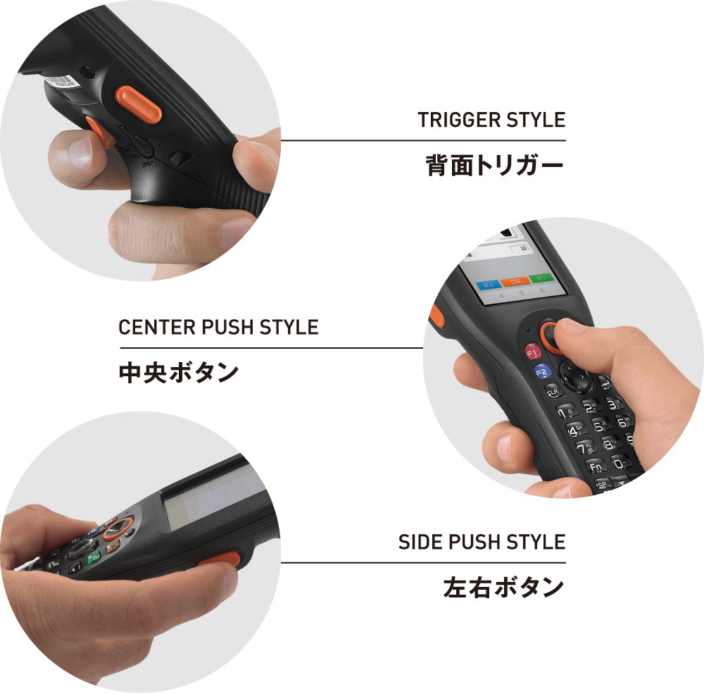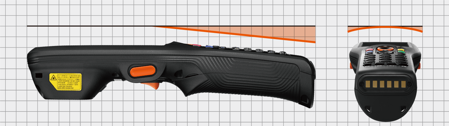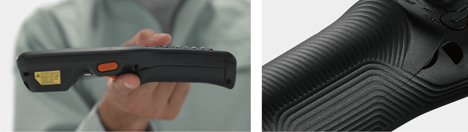 中央、側面、背面に、ボタン・トリガーを配置し、様々な持ち方によるスキャニングに対応。新搭載の背面トリガーは、人差し指でトリガーを引き、親指でカーソルキーを操作するという一連の作業を、自然な動作でこなせます。
