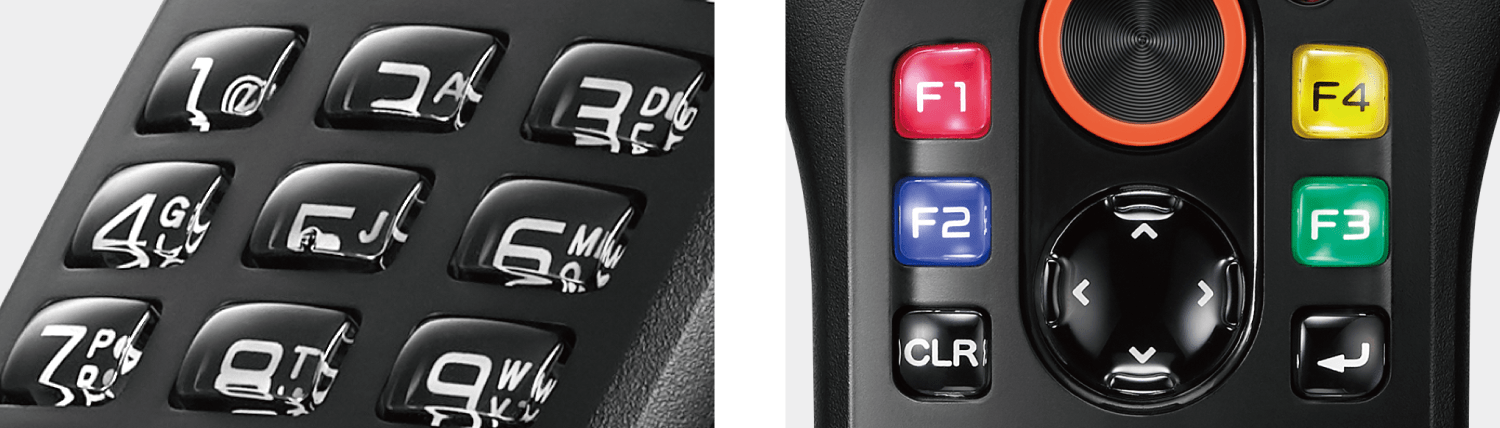 ドーム形状でキーの識別性を向上し、手袋着用時などでも、確実な入力をサポート。また、センタートリガーキーとカーソルキーを分離し誤入力を低減。使用頻度の高いキーを画面直下に集約し操作性を向上します。