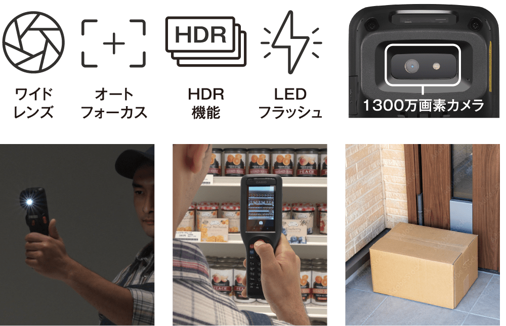 ワイドレンズ(F値2.0、広角28mm相当※)搭載。伝票の電子化、店舗の陳列チェック、配達完了通知など、幅広く役立ちます。
