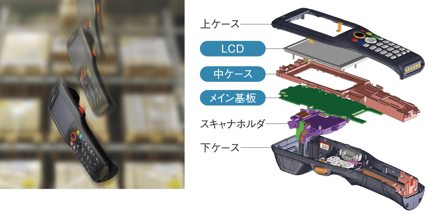 液晶とメイン基板を一体化した3層構造の中ケースを、上下の外部ケース で保護するとともに、随所に高気密パッキンを実装。ハードな使用に耐える強度と気密性を確保しています。