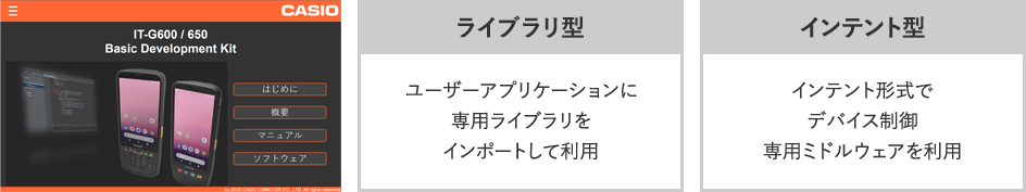 ライブラリ型とインテント型の2タイプの専用開発キットを提供。環境に応じたアプリケーション開発が可能です。