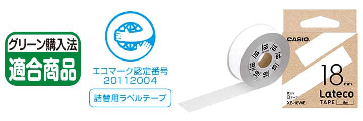 繰り返し使えるテープアダプターに、テープ部分のみを詰め替えてラベルを作成。従来のラベルライターのように、使用後のカートリッジのごみが出ず、プラスチック廃棄量を削減。詰め替え用テープでグリーン購入法適合&エコマークの認定を取得しています。