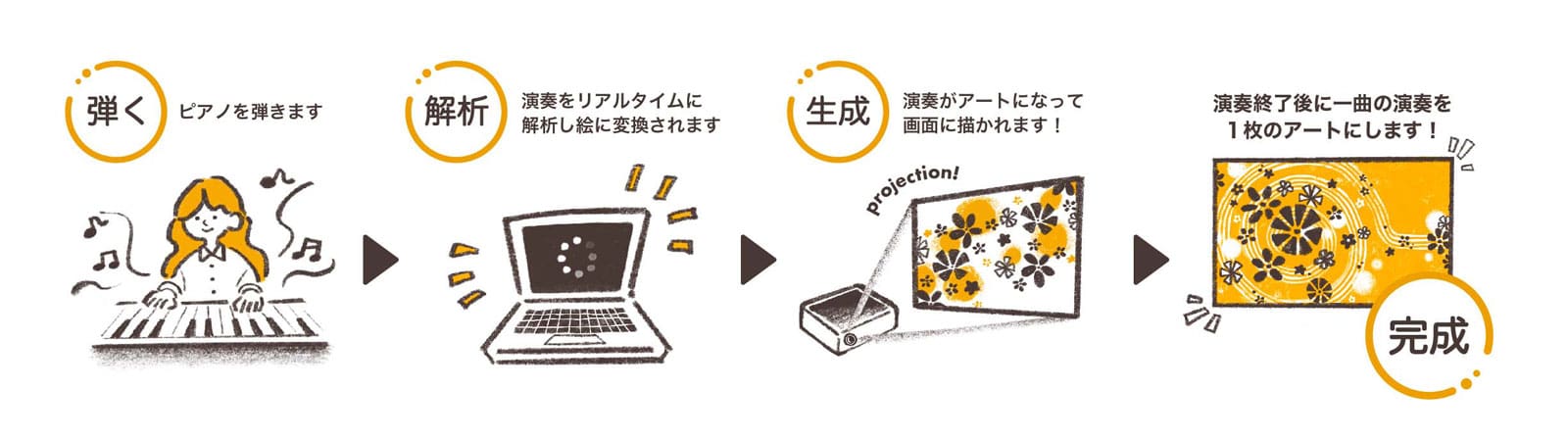 同じ曲でも弾き方による違いで結果が変わるため、二度と同じ絵ができることはありません。