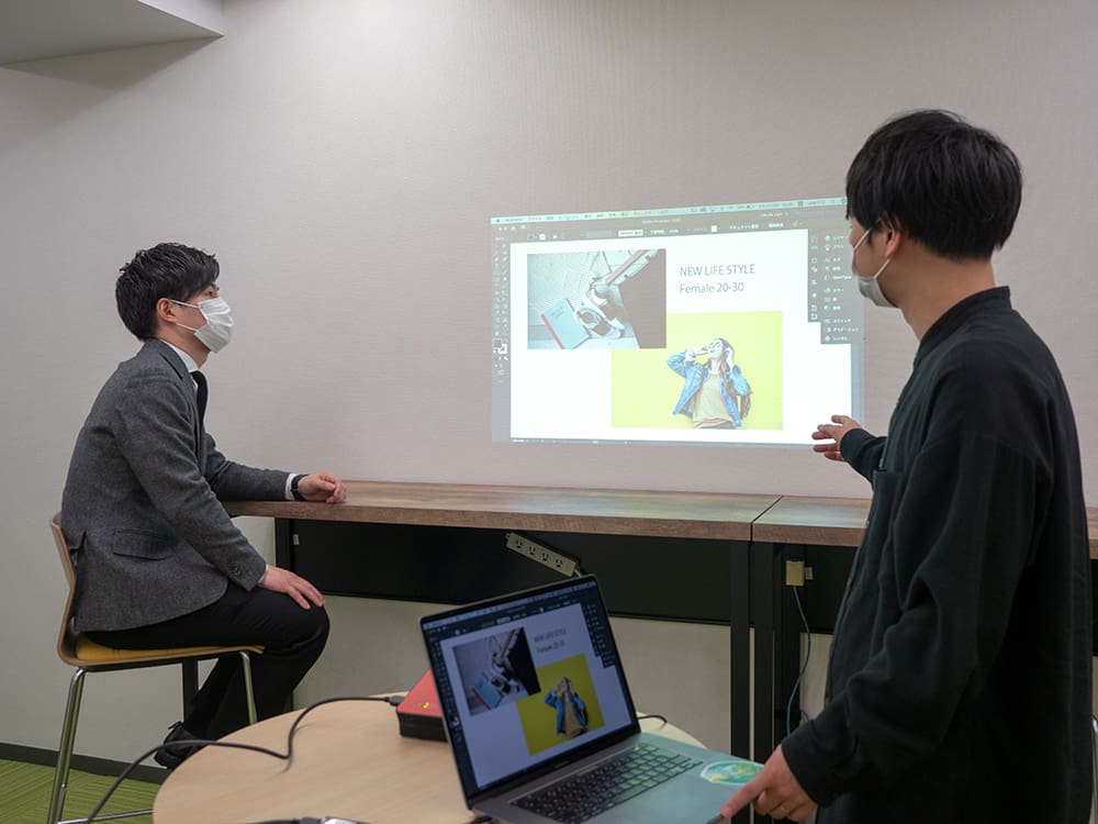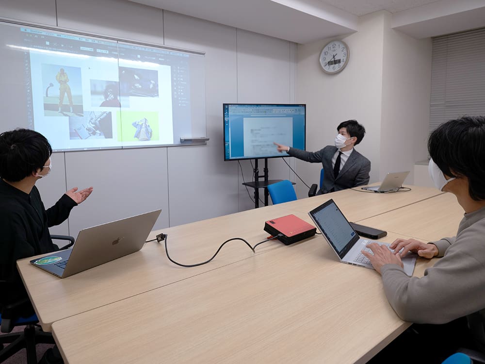 「モニターで与件を確認しながら打ち合わせができるので、あるべき方向性を常に意識しながらアイデアを広げられます。モニターが二台ある会議室はあまりないので、持ち運べるプロジェクターが一台あると大変便利です。」(諏訪氏)