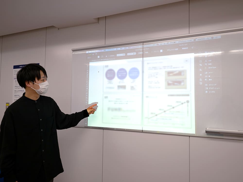 一つの画面を見ることでチームの一体感も高まり、議論も活発になったそうです。細かな文字や数字も大画面で読みやすく、数十ページにわたる企画書も4枚単位で表示してチームで確認。1枚を大きく映せば経営資料の作成や制作物の文字校正にも活用でき、作業が捗りました。