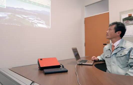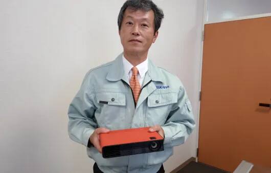 「セールスに当たっては、実物を見せるのが一番ですが、すべてのお客様に当社工場へと出向いてもらうわけにはいきません。そのため、お客様を訪問して動画などで機械の性能などをプレゼンテーションするのですが、当社の製品はサイズの大きなものが多いこともあり、そのスケール感を感じ取ってもらうにはできるだけ大きな画面で見せたい。そこで、これまでは2500ルーメンくらいのプロジェクターを持ち運んで使っていました。しかし、これが5kgから6kgもあり、とにかく重い。スマートフォンぐらいのサイズの小型プロジェクターを試したこともあるのですが、それらは画面が暗すぎて見にくく、使用に耐えませんでした。