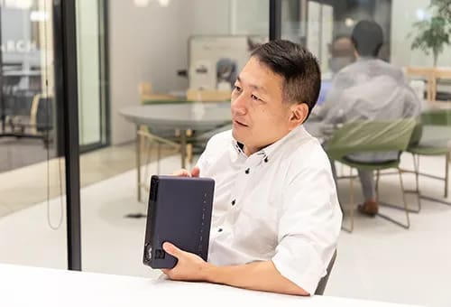 未来創造センターの新規事業創出の仕組みを作るチームの拠点は、東京都羽村市のカシオ計算機羽村技術センターにあり、このARCHはもうひとつの拠点。FORESIGHT VIEWを持っていることで、ARCHでも羽村技術センターでも同じ投映ができ、ARCH内の別のコワーキングスペースに移動しても、同じ使い方ができる、というところがFORESIGHT VIEWのモバイル性の高さ、と牛山氏は評価します。