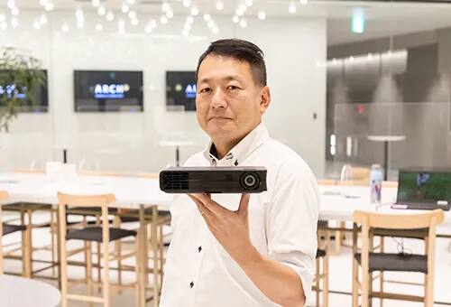 「我々はARCHに、部屋をもっていない。定まった机も、ロッカーもない。なので、ここに来るときは、必ずFORESIGHT VIEWを自宅から持ってきています。いままでの弊社のプロジェクターは、残念ながら、私の通勤鞄に入れて持ち歩くことはできなかった。通勤鞄に入れて持ち歩ける、つまり社内と同じ環境を持ち運べるということは、画期的だと思います。」(牛山氏)
