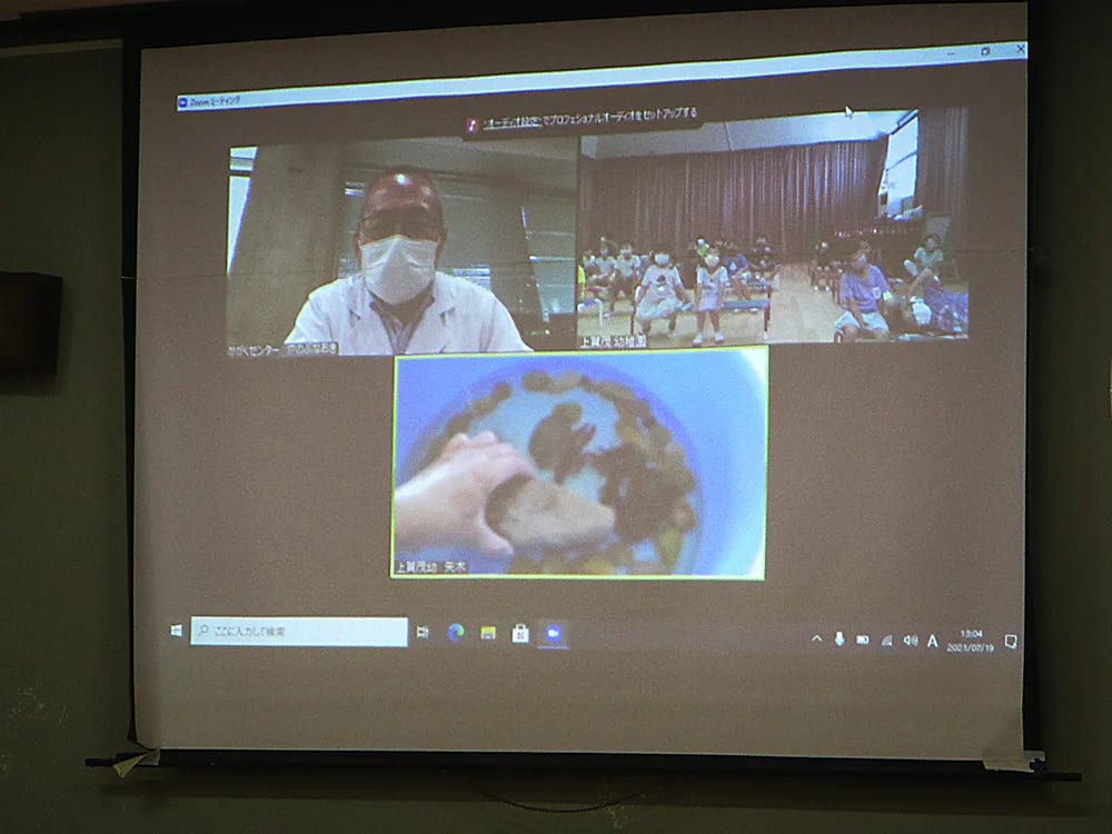コロナ禍で、歯医者さんに来園していただいての歯磨き指導が難しいことから企画した取り組みです。歯医者さんとZoomでつなぎ、その画面をプロジェクターで大きなスクリーンに映してやり取りをしたそう。
