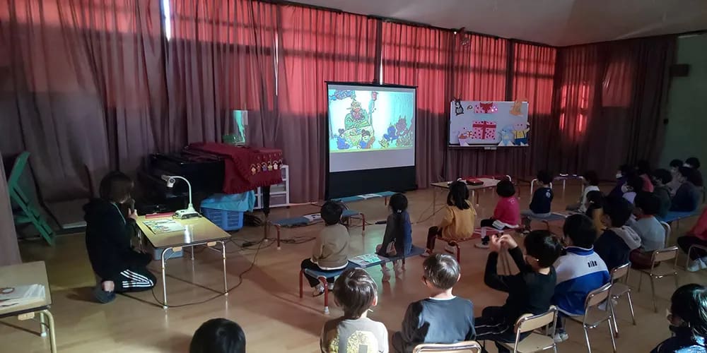 「コロナ禍で椅子の間を開けているため、いつものように絵本を広げても端の方の子には見えていなのではという心配もありました。そのため、プロジェクターで大きく投映し、どこからでも見えるようにできたのは良かったですね」と年長担当の川口先生。FORESIGHT VIEWで大きなスクリーンに映すことにより、子どもたちはいつも以上にお話の世界にひたることができたそうです。