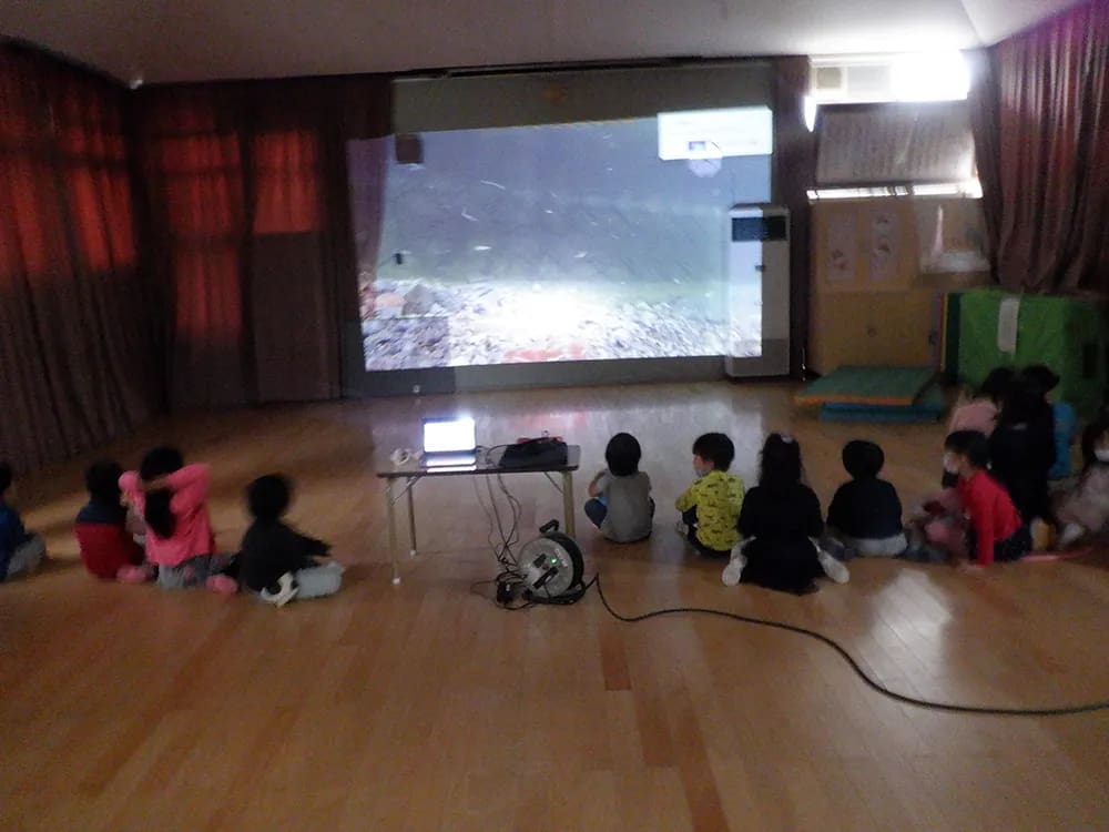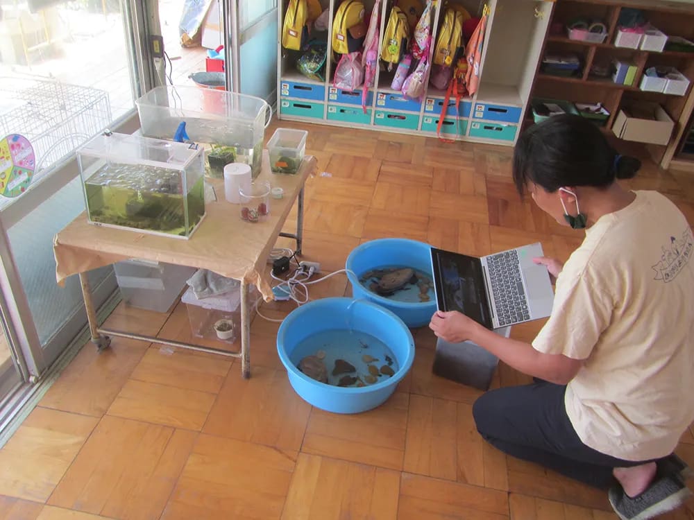 上賀茂幼稚園では、近くの賀茂川から連れてきた生き物たちを飼育しています。園で飼っている生き物についての「なぜ?」「どうして?」を、担任の先生がパソコンで生き物の様子を映しながら‟博士“に質問。生き物の豆知識を教えてもらった子どもたちはとても感心した様子だったといいます。