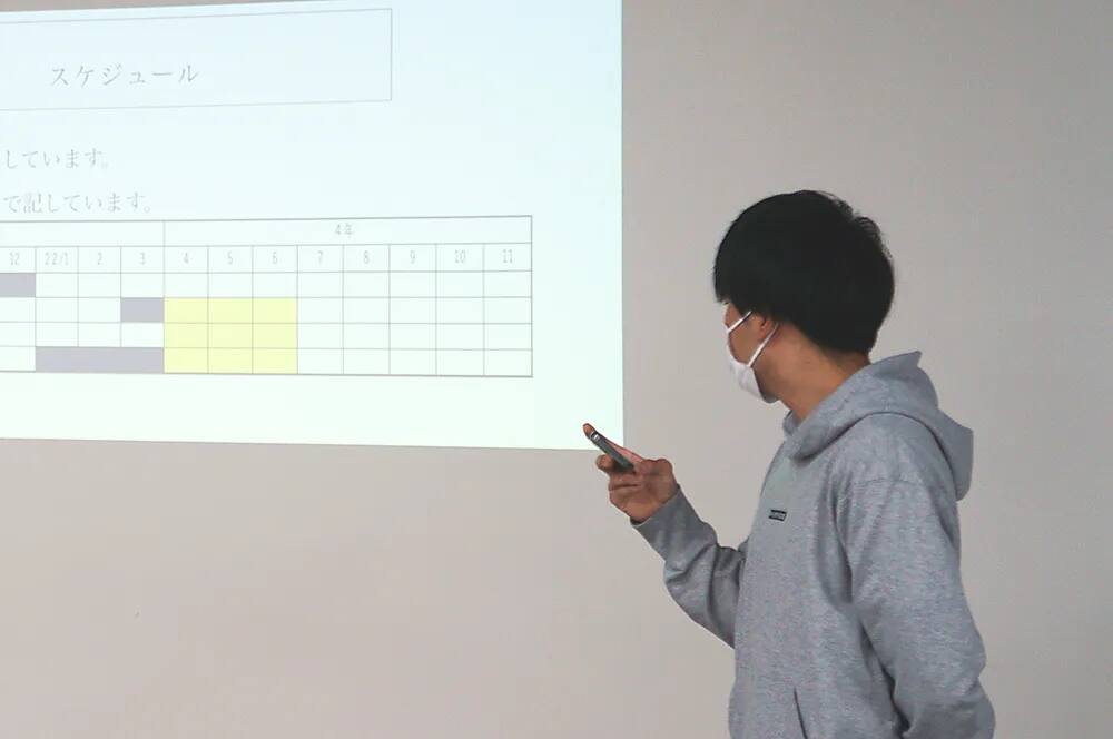 手元にあるスマートフォンに保存された資料を無線で投映しプレゼンする佐藤ゼミの学生