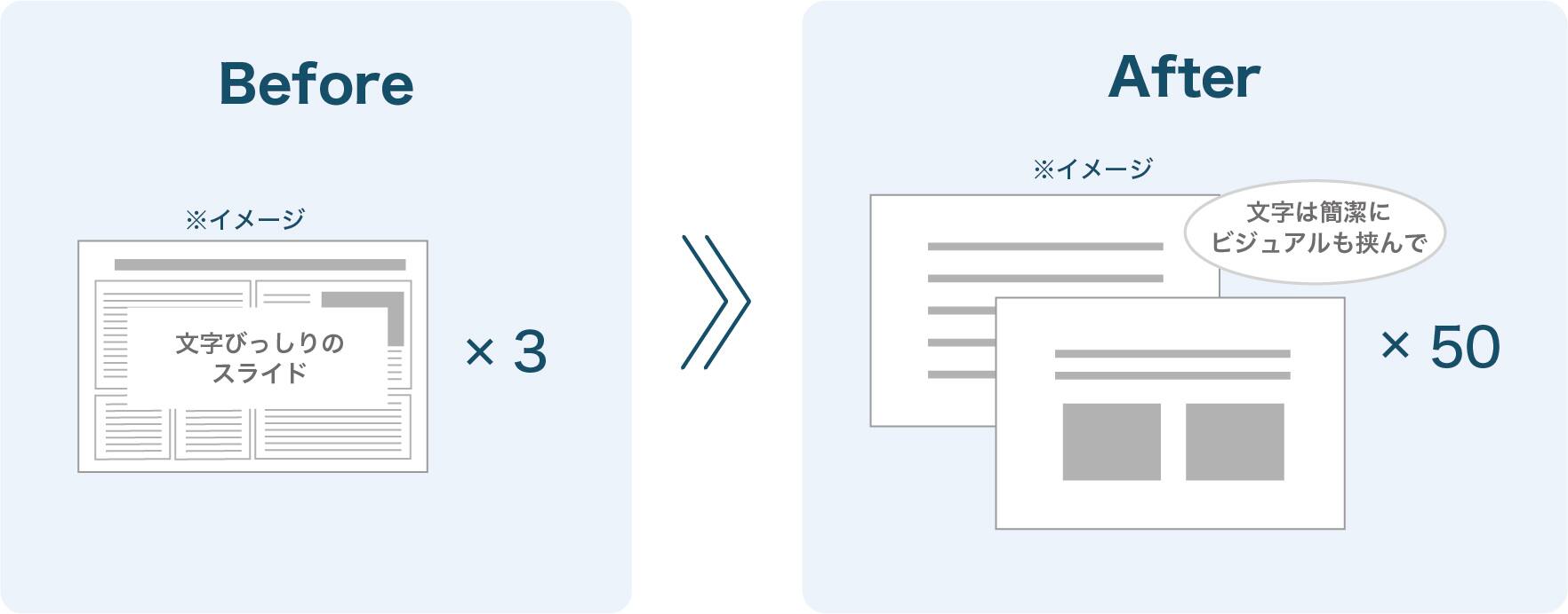 スライドを増やして一枚あたりの文字量を減らします。 テンポの良い、魅力的なプレゼンが可能に。