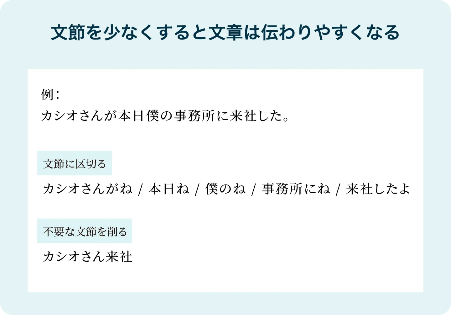 「具体的には、ですますや句読点を削ります。次に文節は少なめに。小学校の国語の授業で習った『◯◯ね』と、”ね”を付けられるまとまりが文節です。情報をシンプルにしてあげると、スライドは見やすくなり、集中してもらえます。」