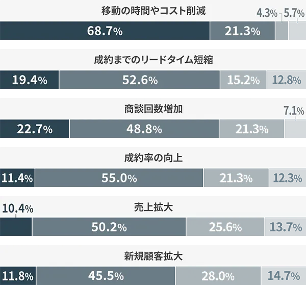 一方で、「成約までリードタイムの短縮」「成約率の向上」「売上拡大」「新規顧客拡大」「新たなビジネスチャンスの機会創出」といった営業活動における重要な項目に関しては、対面と比べて成果が上がったと感じている割合が1割前後~2割未満に限られるという集計結果が出ています。これらの項目では対面と比べて成果が下がったとする回答の割合も高くみられました。