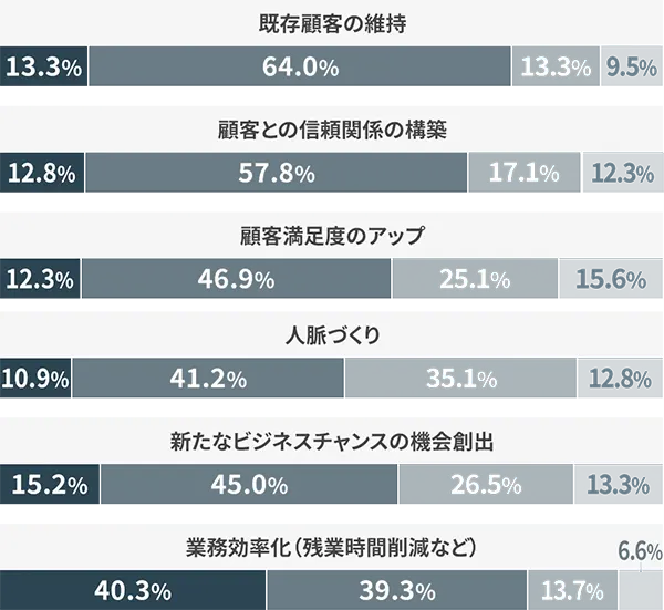 この結果から、オンライン商談はすでにつながりのある顧客への対応や情報収集に対して活用しやすい=効果が期待できることが推察できます。