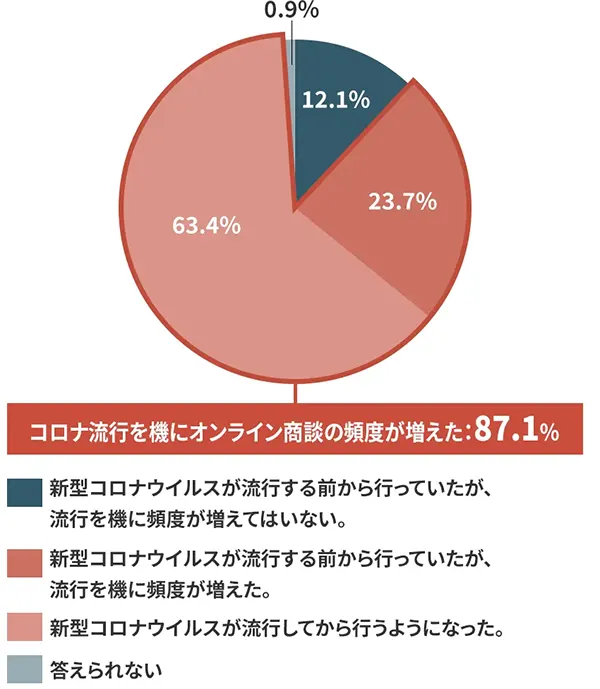 調査①で、オンライン商談を実施していると答えたビジネスパーソン全体の約4割)に導入タイミングについて質問したところ、コロナ流行を機に実施頻度が増えた(23.7%)、コロナが流行してから行うようになった(63.4%)という結果になりました。 つまり、新型コロナウイルスの感染拡大をきっかけにオンライン商談を頻繁に活用し始めた企業が、全体の87.1%にまでのぼるということ。 オンライン商談の広がりは、新型コロナウイルスに多大な影響を受けていることは確実だといえるでしょう。
