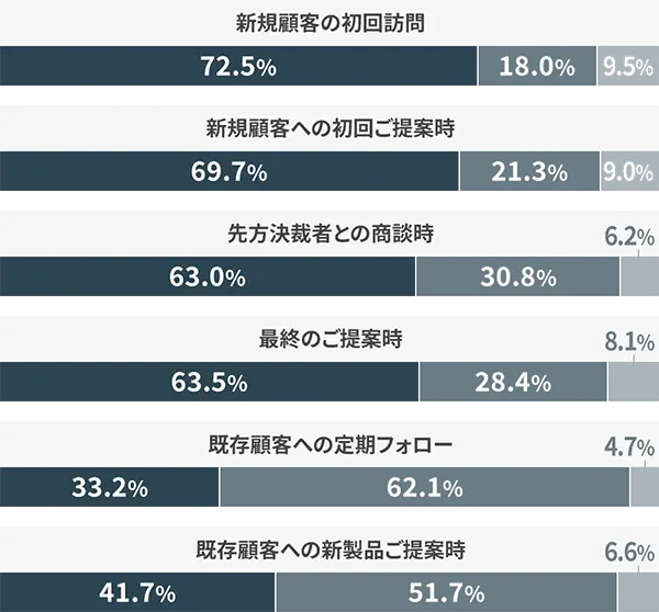すでにつながりのある顧客との商談や情報収集の場合はオンライン商談、大事な商談は対面商談というスタイルが、これからの商談手段におけるスタンダードになりつつあるようです。