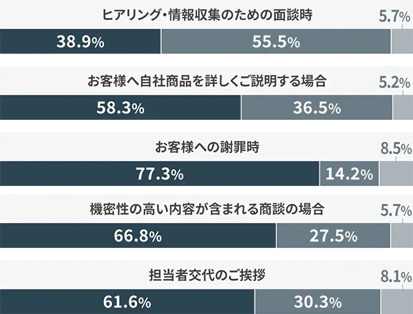 一方、 謝罪(77%)・挨拶(62%)はもちろん、新規顧客への初回訪問(73%)やご提案(70%)、自社商品を詳しく説明する場面(58.3%)、機密性高い内容の商談(67%)、決裁者との商談(63%)、最終的なご提案(64%)などの場合は、対面手段をメインとして取り組んでいる営業者が多く、コラムVol.1における「大事な商談は対面で!」という主張の正しさを確認できる結果となりました。