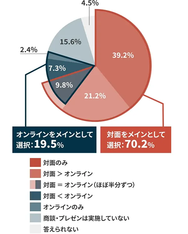 一方で、70.2%が今でも対面をメイン手段として選択。そのニーズはいまだに高く、オンライン商談はサブ的な手法として活用されることが多いようです。
