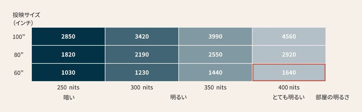 また、投映サイズもルーメンに影響します。60インチの投映サイズで1640ルーメン以上、80インチで2920ルーメン以上が必要な明るさの目安と言われています。少人数から10人程度が入る会議室で商談する場合は60インチ程度の投映サイズになるので、2000ルーメンもあれば見えづらくなりません。小型プロジェクターの中には目安の明るさに達しないものもあり、明るい部屋や部屋の電気をつけた状態で投映画面が見えづらい場合は、部屋を暗くすることが必要となります。それですと、せっかくのプロジェクターのメリットが活かされないかもしれません。