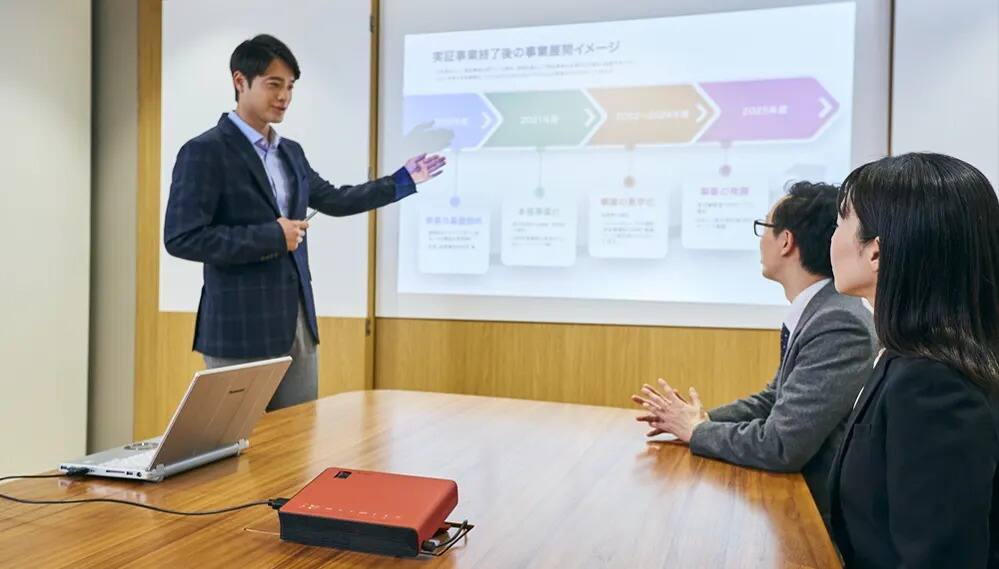 また、投映画面がとても明るいので、部屋の照明をつけたままでも使用できます。いつもの使い慣れた機材を訪問先へも持ち運べるので、「プロジェクターにつながらない」といったリスクもありません。