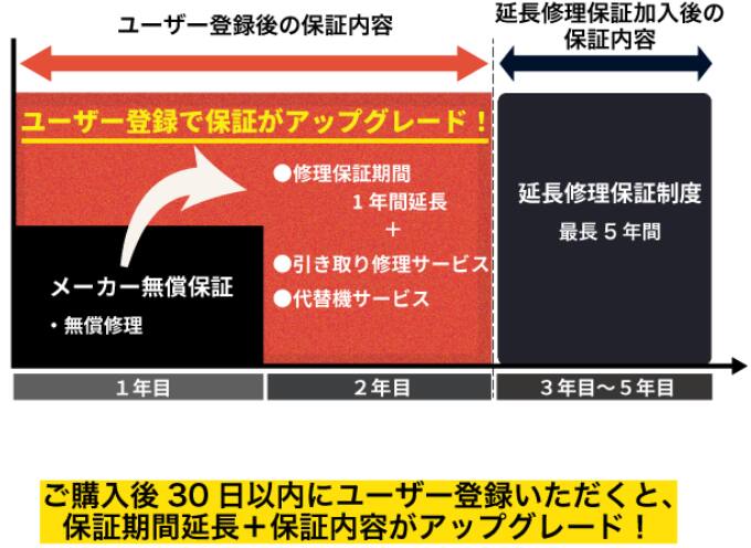 ご購入時に自動的に付与される1年間のメーカー無償保証期間に加え、ご購入後1ヶ月以内にユーザー登録いただくと無償修理期間を1年間プラスし保証内容もアップグレードいたします。※ また上記保証とは別途、定額料金制の延長修理保証制度もご利用いただけます。
