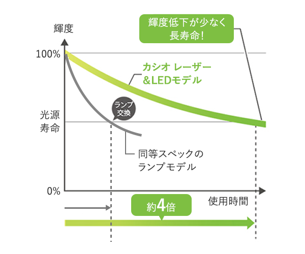 従来のランプ光源タイプより輝度低下がなくランプ交換も不要です。